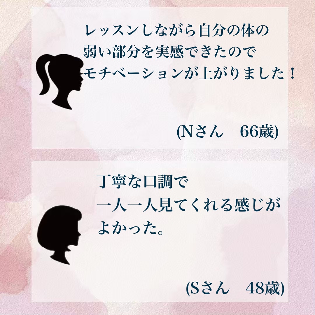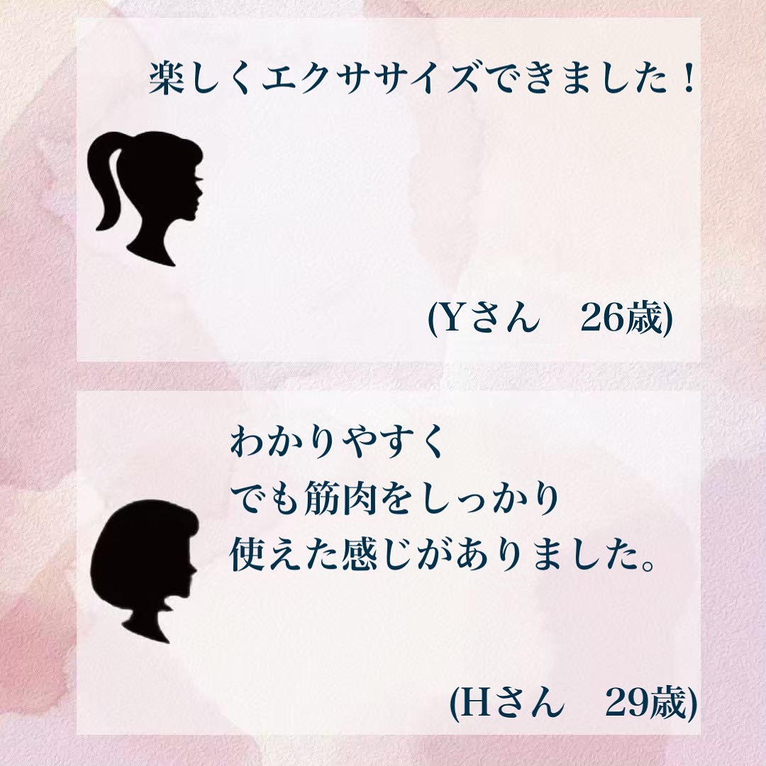ピラティスをしたことない方や、難しかった、楽しかった、丁寧に教えてもらえた等いろいろなお声をいただいて
