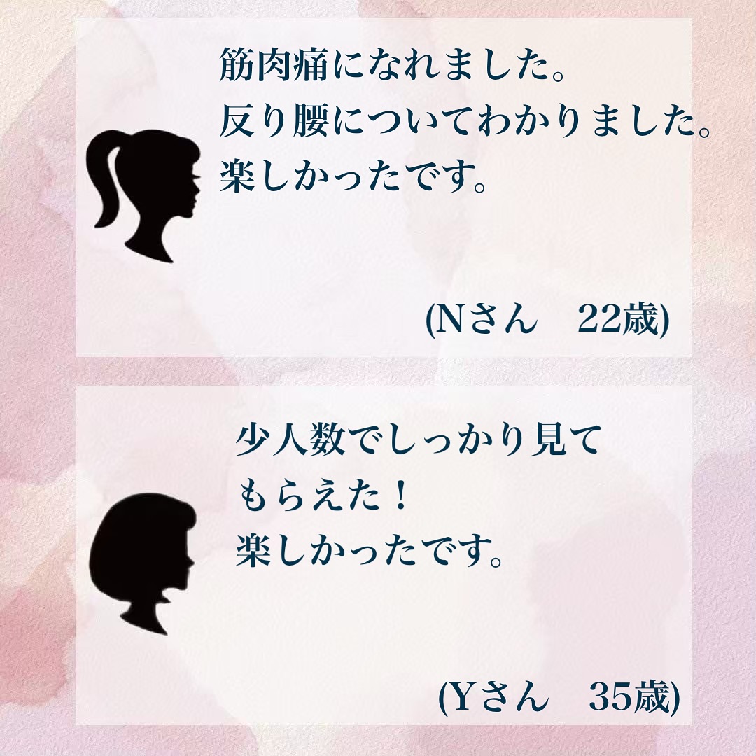 ピラティスをしたことない方や、難しかった、楽しかった、丁寧に教えてもらえた等いろいろなお声をいただいて