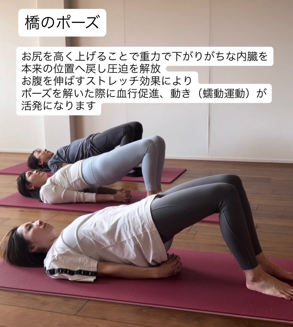 2. 橋のポーズ:縮まったお腹を心地よく伸ばして、胃腸の圧迫を解放。